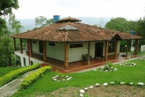 Casa de campo moderna con fachada de piedra, estilo castillo medieval.
